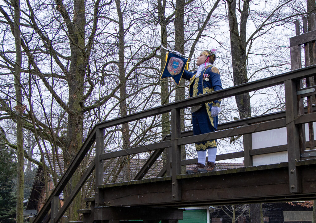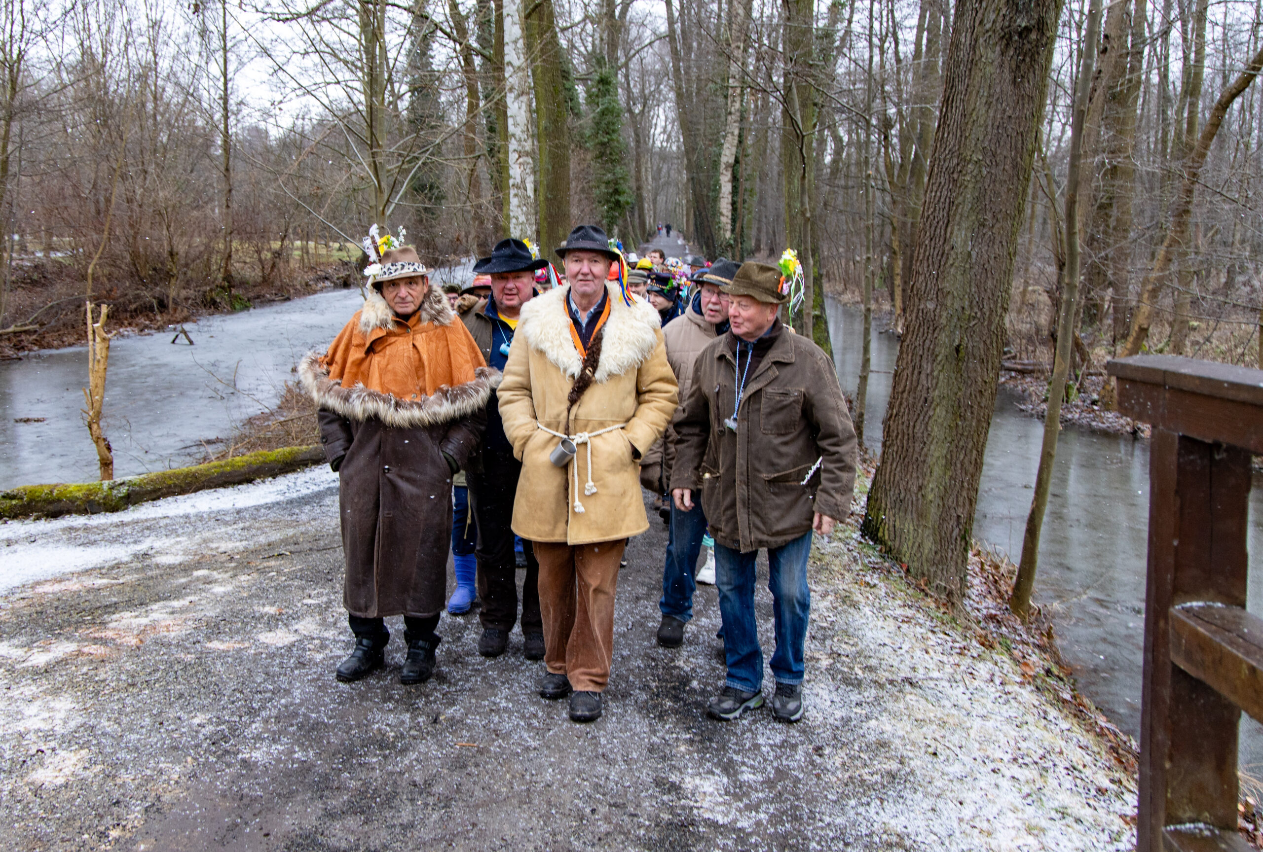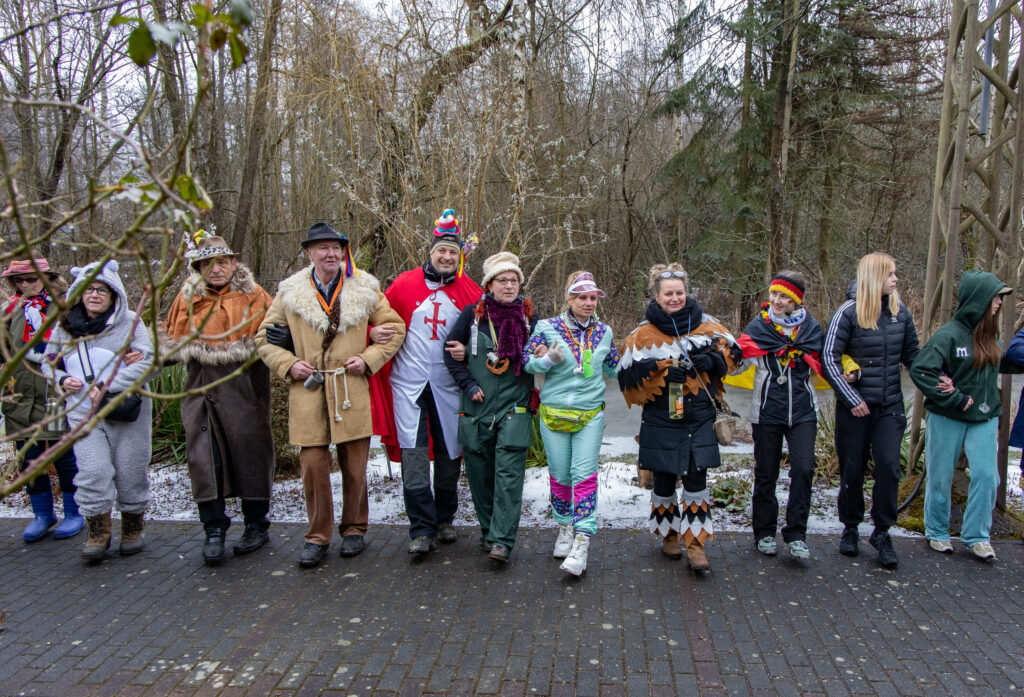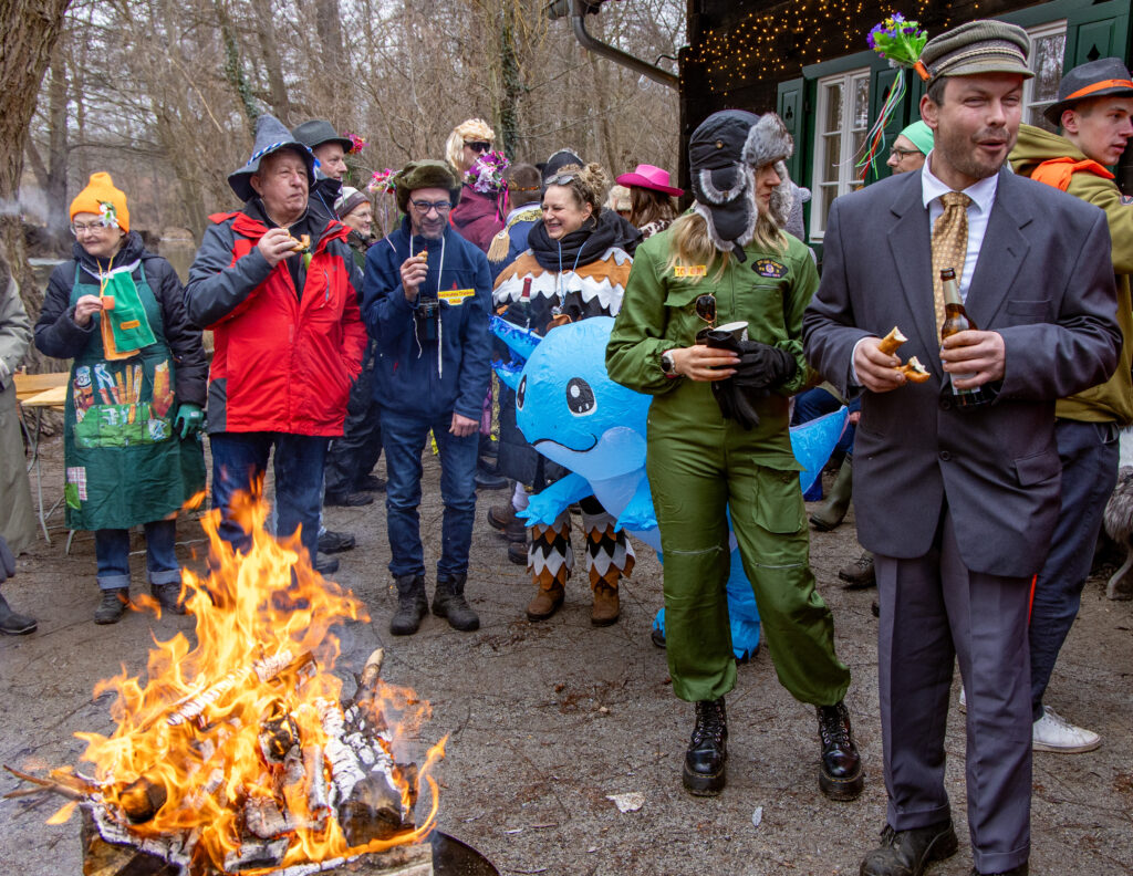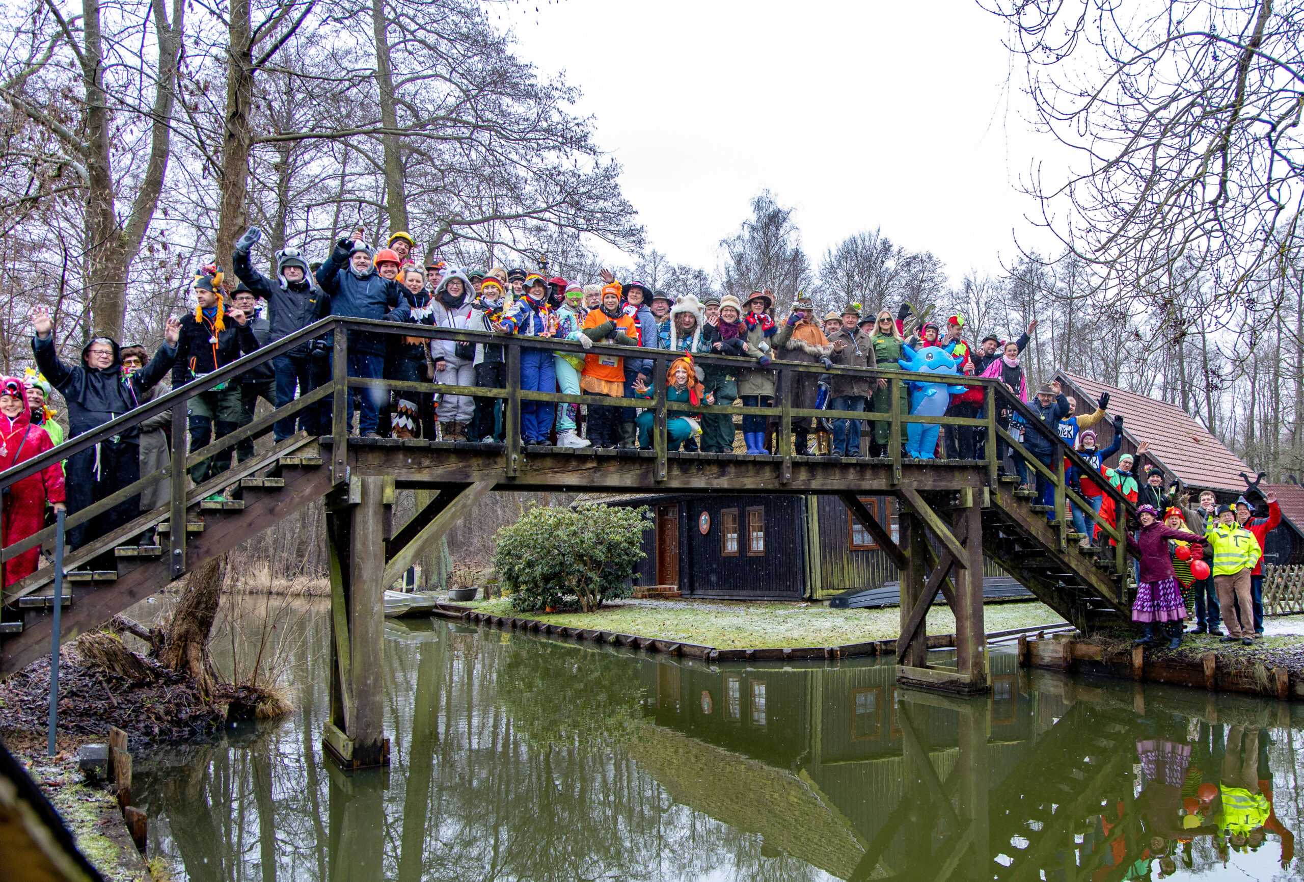 Am 14. Februar 2026 machten sich die Lehd’schen auf zum Zampern ins Dorf, wie jedes Jahr um diese Zeit. Dieser Brauch des Winteraustreibens mit ordentlich Lärm und „schrecklichen“ Gestalten findet derzeit in fast allen Niederlausitzer Dörfern statt. Während anderswo meist nur die Straßenseiten gewechselt werden, geht es in Lehde sportlicher zu: Um möglichst viele im Spreewalddorf aufsuchen zu können, um dort Zampergaben zu erheischen oder bewirtet zu werden, müssen Brücken mehrmals überquert werden, manche Wege müssen mehrfach gegangen werden. Einige Höfe können nur übers Fließ erreicht werden. Manche Fließe waren allerdings schon eisfrei, sodass die ganze Gesellschaft, über 50 Personen, mit einem Lastenkahn einen Teil der Zamperstrecke bewältigen konnte. Auf Kaupen 6, einer beliebten Gaststätte und dem Ziel der etwas anderen Kahnfahrgesellschaft, wurden die Zamperer ebenso verwöhnt, wie schon vorher an den anderen aufgesuchten Orten: Es gab die übliche Bewirtung – und hier ein prasselndes Feuer, was sehr viel Zuspruch fand, besonders bei den Musikern, dem Feuerwehr-Spielmannszug Lehde, die sich endlich die Finger wärmen konnten.