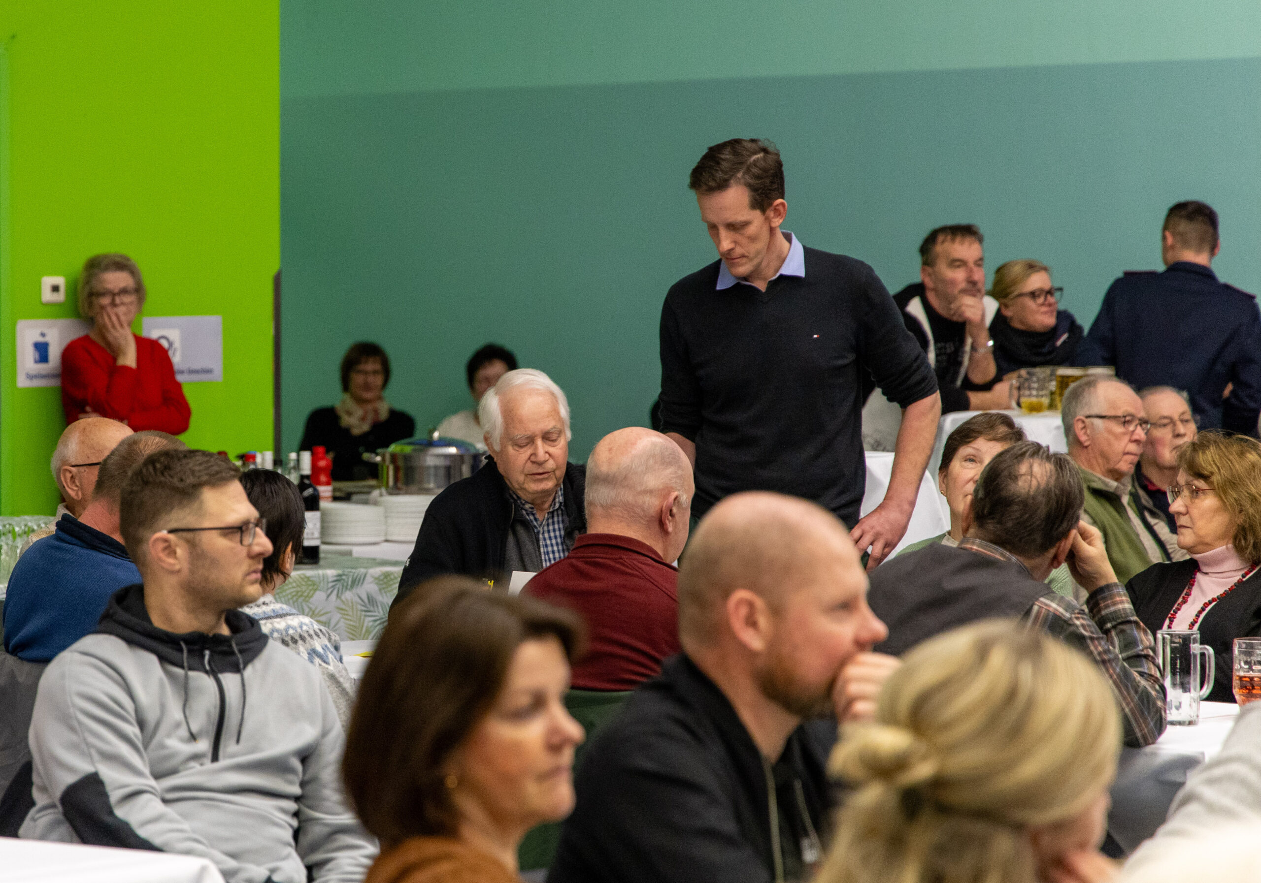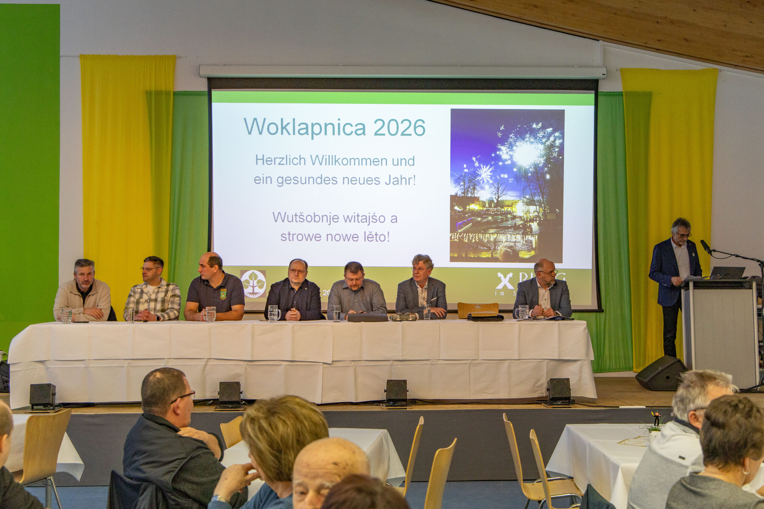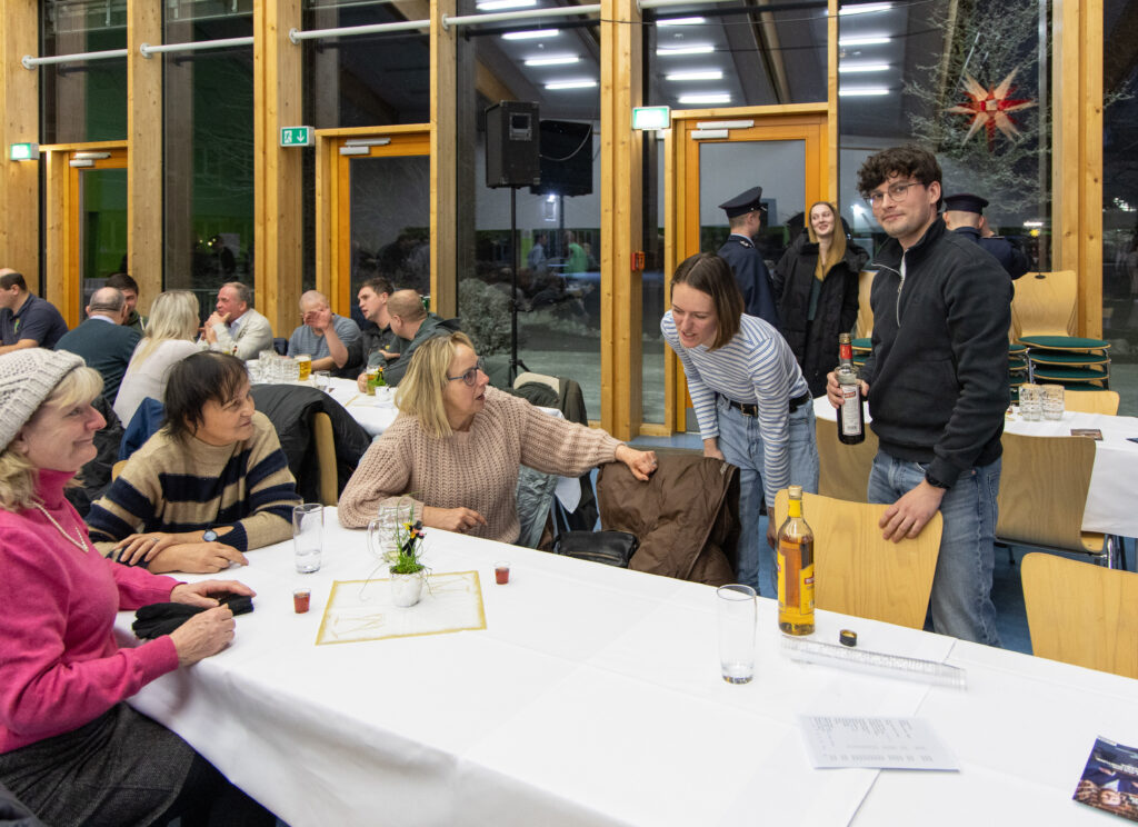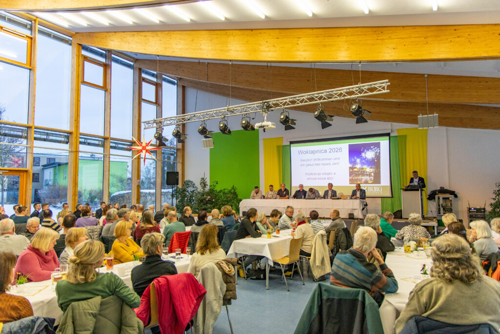 The onset of snowfall and slippery roads didn’t stop the event from taking place at the Burger school: despite the weather, over 130 Burger residents turned up for the traditional woklapnica on Sunday afternoon. This ancient form of citizens’ assembly in the Sorbian/Wendish settlement area has always served to “review” the old year: the mayor reports on what has happened, names additions and departures, gives an outlook for the coming year and lets the citizens have their say.